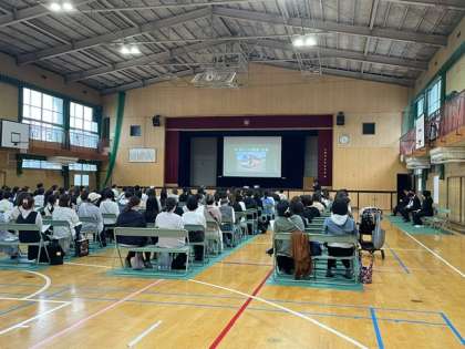 ?体育館にて、1年生一泊移住保護者説明会を行なっております。