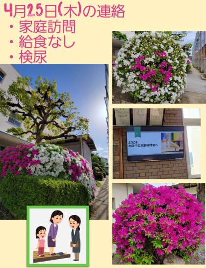 4月25日(木)の連絡 公開日 2024/04/24 更新日 2024/04/24 お知らせ 明日25日(木)から『家庭訪問』が始まります。午前中45分×4時間で下校します。 それにともない給食は実施されません。 部活動については、顧問から連絡に従ってください。 明日は『検尿』の回収があります。 いいね(0)