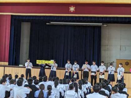 78期生修学旅行のスローガン、テーマソングも趣向を凝らしたサプライズ形式で発表され、たいへん盛り上がりました。その後、改めて気持ちを引き締めて、しおりの説明が始まりました。