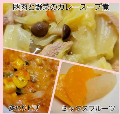豚肉と野菜のカレースープ煮 公開日 2024/05/10 更新日 2024/05/10 お知らせ 大きくカットされた野菜がいっぱい。本日は『豚肉と野菜のカレースープ煮』です。 カレースープで食欲が増しますね。 デザートには、冷たい『ミックスフルーツ』でした。 いいね(0)