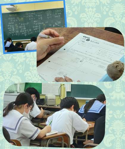 二年生数学授業では、中間テストに向けて対策プリントに取り組んでいます。