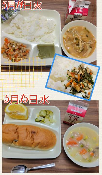 かやくご飯と鶏肉とコーンのシチュー 公開日 2024/05/15 更新日 2024/05/15 お知らせ 5月14日(火)の給食は『かやくご飯』の和風。本日15日(水)は『鶏肉とコーンのシチュー』洋風でしょうか。 和風が好きな人もいれば、洋風が好みという人もいることでしょう。 学校給食はバラエティーに富んでいます。 いいね(0)