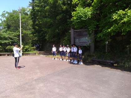 班ごとにスタートし、山の展望台をめざします。