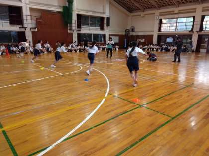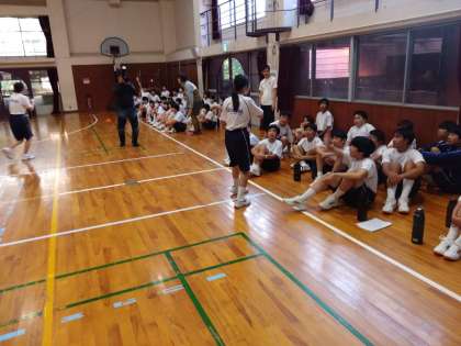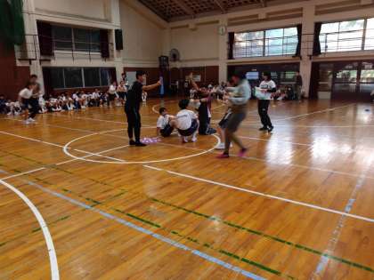 中央にある紙に書かれたお題に合う人をどれだけ早く連れてこれるかを競います。「〜部の人」「〜へいったことのある人」などなど。中には「身長180cm以上の人」というお題も。この体育館には、、、一人しかいません!