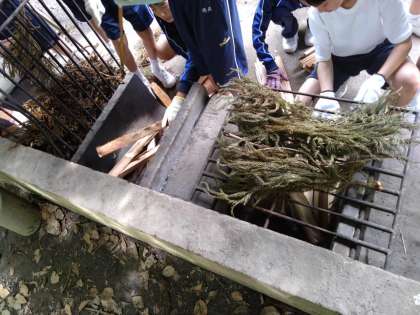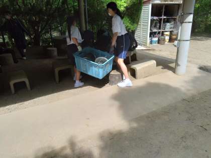 かまどの火をおこす係、食器を運ぶ係、食材を調理する係、それぞれの分担を一生懸命頑張っています。