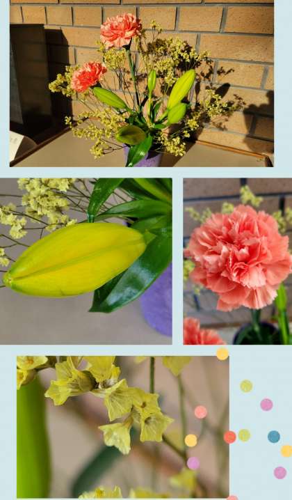 昨日、地域の方から玄関正面に可愛らしい『カーネーション』『ハナハマサジ』『ユリ』のお花を生けていただきました。