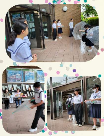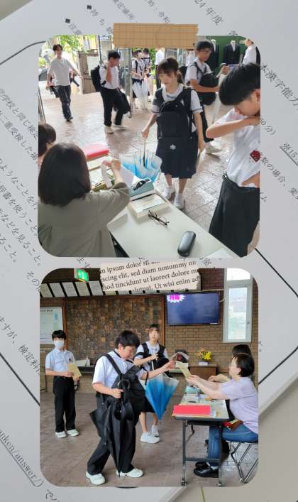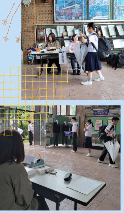 『漢字検定』申込み受付の最終日です。雨の登校のなか、玄関で傘を折りたたみ鞄から申込み封筒を出し申し込んでいました。