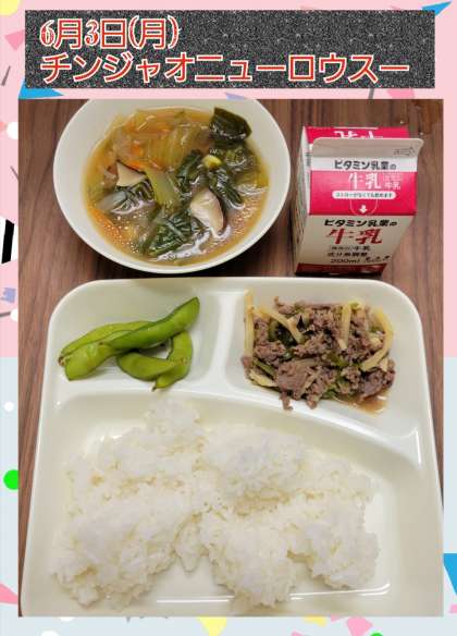 6月最初の給食は『チンジャオニューロウス』と『中華みそスープ』でした。