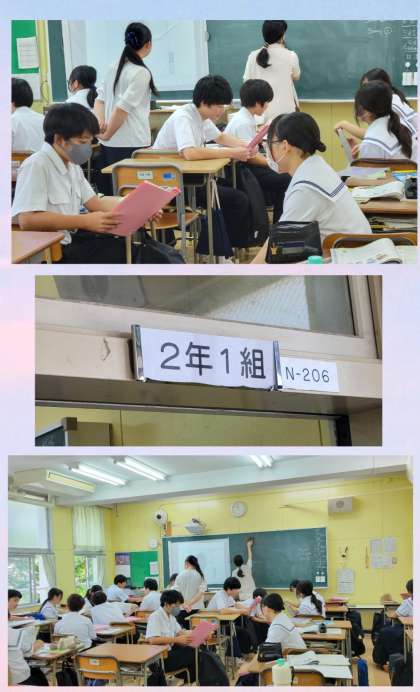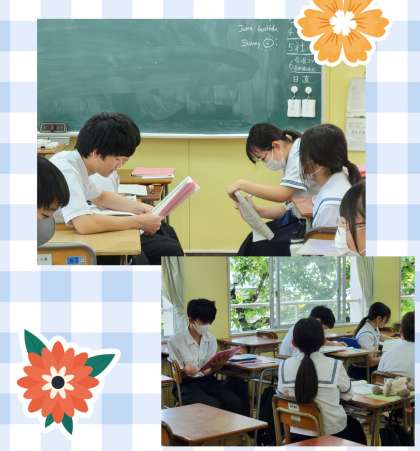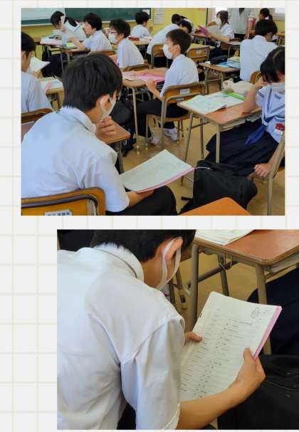 二年生英語科では、習熟度別学習を行っています。1組の教室では、半分の生徒がペアワークで単語、熟語等の確認を行っていました。
