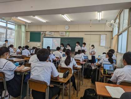今期のテーマは和食です。班で役割分担し、発表タイトル、和食の魅力、現状、課題、提案、まとめなどのスライドを一人一枚作成し、班でクラスメイトに発表しました。スライドには、説得力が増すような各班主張の根拠となるグラフやアンケート結果などの資料が出典付きで添付されていました。文字の大きさ、アニメーションの出し方にも、よりみんなへ伝わるようにと多くの工夫がされていました。