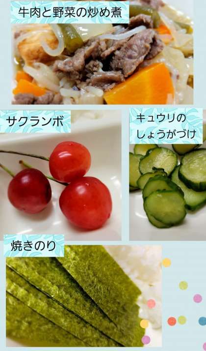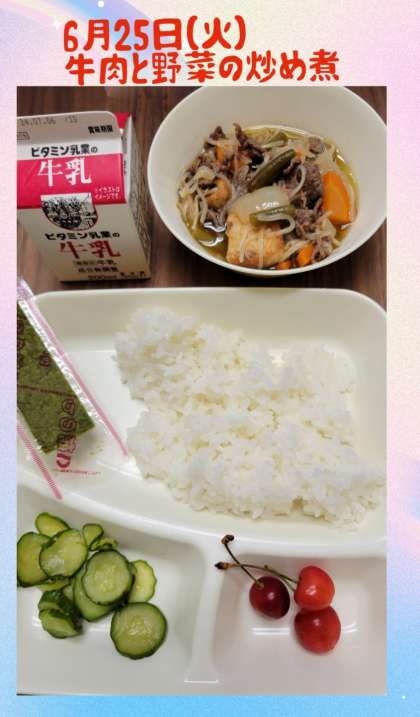 牛肉と野菜の炒め煮 公開日 2024/06/25 更新日 2024/06/25 お知らせ 6月25日(火)の給食 『牛肉と野菜の炒め煮』 『キュウリのしょうがづけ』 『サクランボ』 『焼きのり』 『牛肉と野菜の炒め煮』は、大きな具材がいっぱい! 糸こんにゃく、厚揚げ、にんじん、玉ねぎ、糸こんにゃく、えのきだけ、三度豆の7種類も入っています。牛肉を入れると8種類ですね。 栄養バランスが素晴らしいですね。 いいね(0)