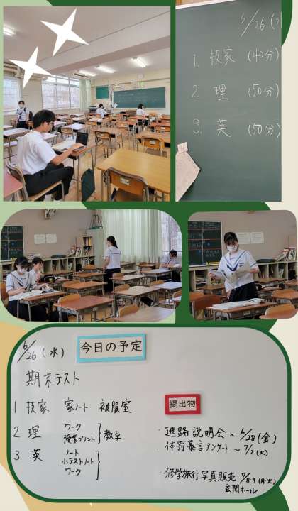 8時、三年生教室では数人の生徒が登校しテストに向けて準備していました。