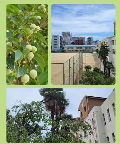 高倉中学校の敷地は大きく、たくさんの植物が季節ごとにさまざまな表情を見せてくれます。正門のパンジーとその横のオリヅルラン。オリヅルランは、今は花こそ見えませんが小さな花を咲かせ、涼しげな表情でこの蒸し暑い季節には、近くあるだけで癒される植物です。増やすのも容易です。