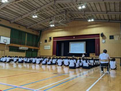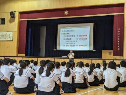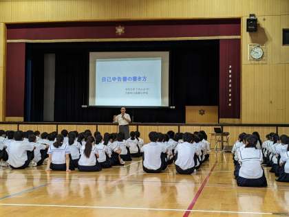 中学生までに自分が頑張ってきたことをふりかえり、前向きに進路選択を捉えて、中学校卒業後にどのような道に進みたいのかを真剣に考えて準備しましょう!生徒たちは顔をあげて集中して聴いています。