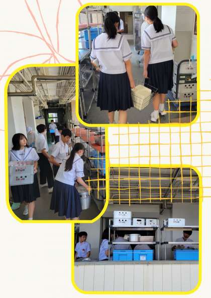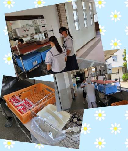 給食が終わった学級の係生徒たちが食器等を返却しに配膳室に集まってきます。