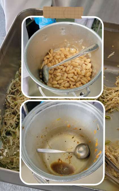 ご覧の通り、牛丼用の食缶は完食されていました。他の副菜は少しずつ残っています。『大福豆の煮もの』は甘くて美味しかったのですが、少し残していました。