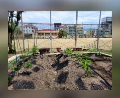 学習園に、夏を代表する野菜である『トマト』が、小さな美しい花も咲かせています。真っ赤な実をつける前にきれいな花を咲かせるトマト。これからの成長が楽しみですね。