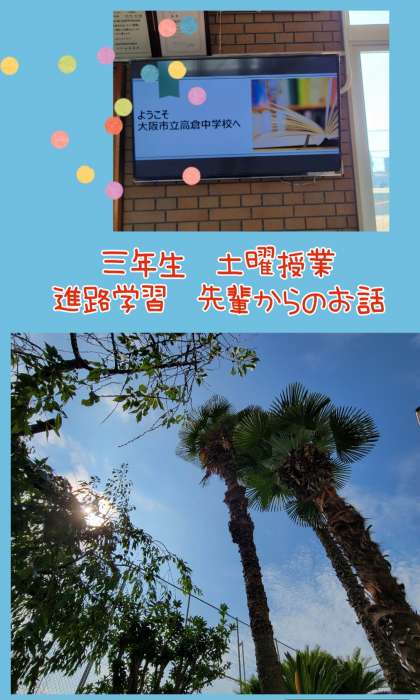 土曜授業 三年生進路学習 公開日 2024/07/06 更新日 2024/07/06 お知らせ 7月6日(土)晴れ 朝から強い日差し、9時現在30度超えていました。 本日は、三年生がこの春卒業した先輩から進路について、経験談等を聞く『進路学習』を行いました。 いいね(0)