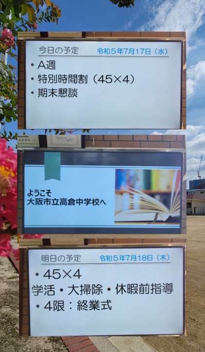 懇談会 最終日 公開日 2024/07/17 更新日 2024/07/17 お知らせ 7月17日(水)晴れ 期末懇談会の最終日の朝です。 校庭の百日紅の花が咲き始めました。 樹々に咲く花の少ない夏に、枝先に広がる緑の葉を覆って広がる百日紅の赤紫の花々はとても目立つ存在です。 明日は、一学期終業式があります。いよいよ夏休みに入ります。 この間、保護者の皆さん、期末懇談会にご来校いただきありがとうございました。 いいね(0)