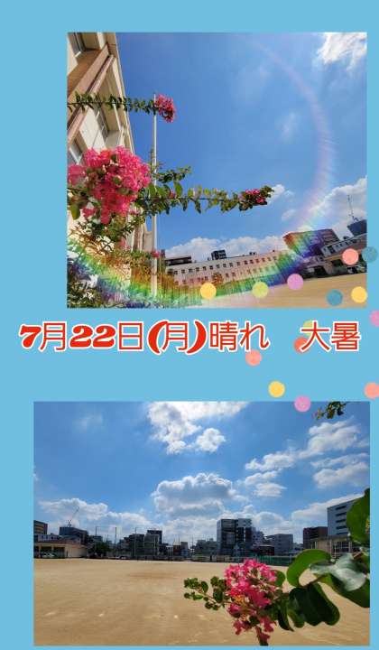 7月22日(月) 大暑 公開日 2024/07/22 更新日 2024/07/22 お知らせ 本日7月22日(月)は、24節気の『大暑』です。一年でもっとも暑さが厳しく感じられる頃となっています。 昨日、大阪でも梅雨明けが発表され、これから気温がさらに高くなる日が続く予報です。こまめな水分補給を心がけるなど熱中症対策を意識的に行いましょう。 いいね(0)