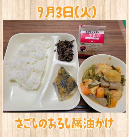 さごしのおろし醤油かけ 公開日 2024/09/03 更新日 2024/09/03 お知らせ 9月3日(火)給食 『さごしのおろし醤油かけ』 『含め煮』 『牛ひじきそぼろ』 含め煮は、大きくカットされたにんじん、玉ねぎ、つなこんにゃく、じゃがいもなどの野菜類がいっぱい。そこに厚揚げとさんどまめも入っています。 今日はさらに、牛ひじきそぼろをご飯にのせて頂きましたが、本当に美味しくご飯が進みます。 牛ひじきそぼろのおにぎりなどは簡単に作れそうですね。 いいね(0)