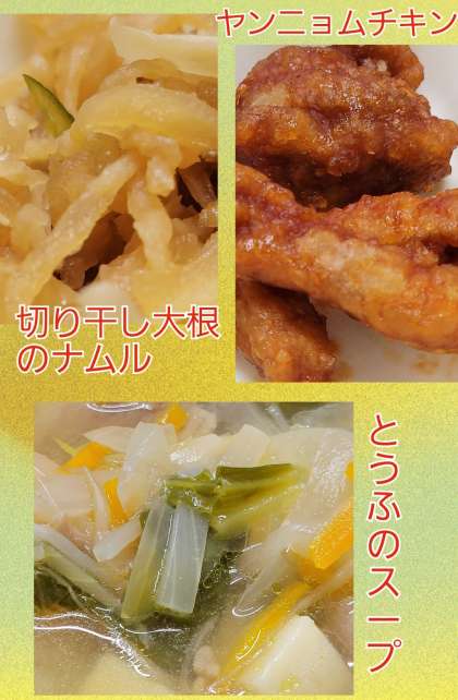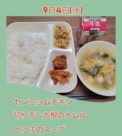 ヤンニョムチキン 公開日 2024/09/04 更新日 2024/09/04 お知らせ 9月4日(水)給食 『ヤンニョムチキン』 『切り干し大根のナムル』 『とうふのスープ』 今までの記憶にない給食メニュー、『ヤンニョムチキン』が今日のメイン。 鶏肉をコチュジャン、ニンニク、ケチャップ、みりん等から作る甘辛いソースで味付けしていました。韓国のフライドチキンの一種だそうです。 たいへん美味しかったですね。 いいね(0)