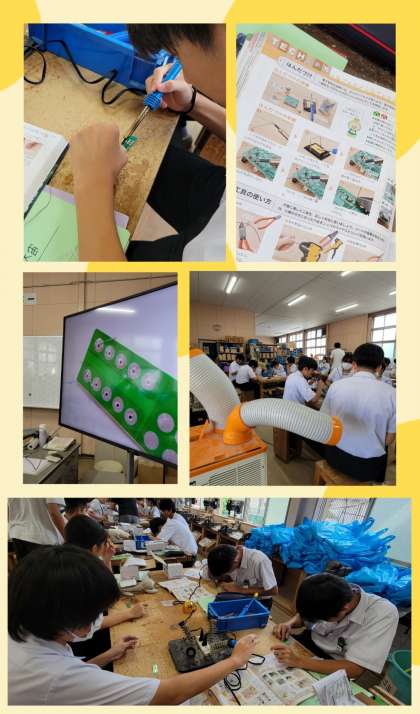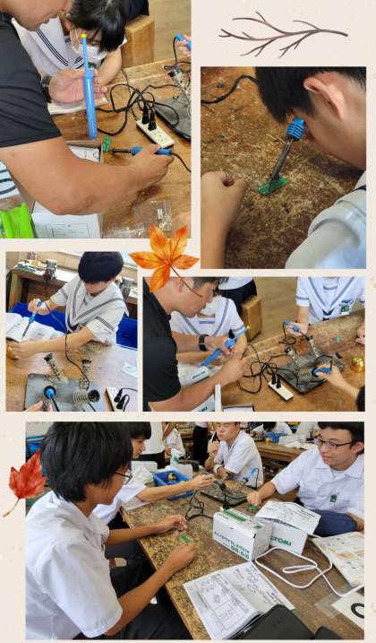 熱せられたはんだこての先端を使い、はんだを溶かしながらリード線を固定していきます。テキストでもその詳細が示されていますが、溶かしたはんだは高熱!その反面はんだこてを離すと直ぐに固まってしまうという難しさがあります。