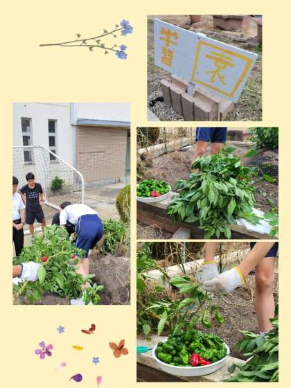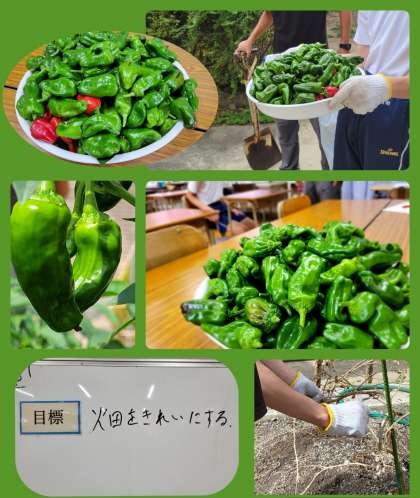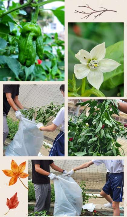 学習園、ピーマンが鈴なり実っていました。別の畝では、収穫済みのトマトの枯れた苗と少しの茄子があります。今日はそのピーマンの収穫と不要になった枯れたトマト苗を根こそぎ引っこ抜く抜根作業が目標です。