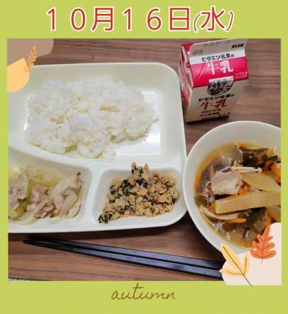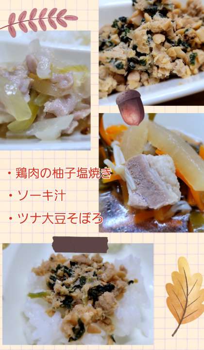 鶏肉のゆず塩焼き 公開日 2024/10/16 更新日 2024/10/16 お知らせ 10月16日(水)給食 『鶏肉のゆず塩焼き』 『ソーキ汁』 『ツナ大豆そぼろ』 鶏肉のゆず塩焼きは、塩と柚子で下味を付けた鶏肉に玉ねぎを加えて蒸し焼きにしています。味の染み込んだ柔らかな鶏肉に玉ねぎの甘味が加わり、美味しい一品となっていました。 ツナ大豆そぼろも、温か御飯にまぶして美味しく頂きました。 いいね(0)