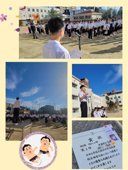 秋季総合体育大会、『相撲』において、第三位に輝きました生徒の伝達表彰を行いました。おめでとうございます。