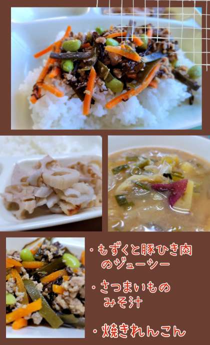 旬のさつまいものみそ汁 公開日 2024/10/21 更新日 2024/10/21 お知らせ 10月21日(月)給食 『もずくと豚ひき肉のジューシー』 『さつまいものみそ汁』 『焼きれんこん』 温かい御飯に『もずくと豚ひき肉のジューシー』をのせ、いただきました。食べやすくご飯が進みます。また栄養満点です。 『さつまいものみそ汁』も大きな旬のさつまいもがたくさん入り、これだけでもお腹を満たしてくれます。 美味しかったですね。 いいね(0)