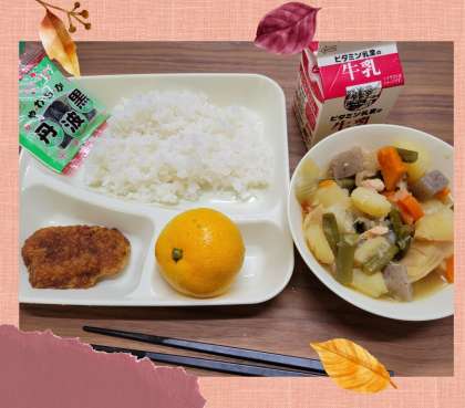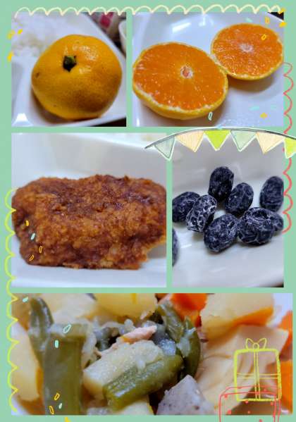 『みそカツ』『じゃがいもと野菜の煮もの』『みかん』『ソフト黒豆』