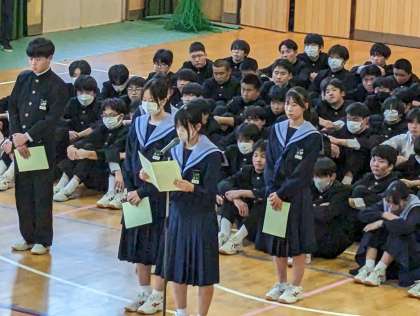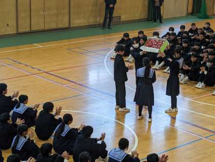 続いて、在校生から卒業生の代表2名に式当日のコサージュが贈られました。