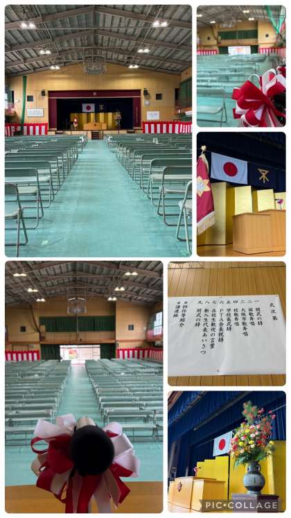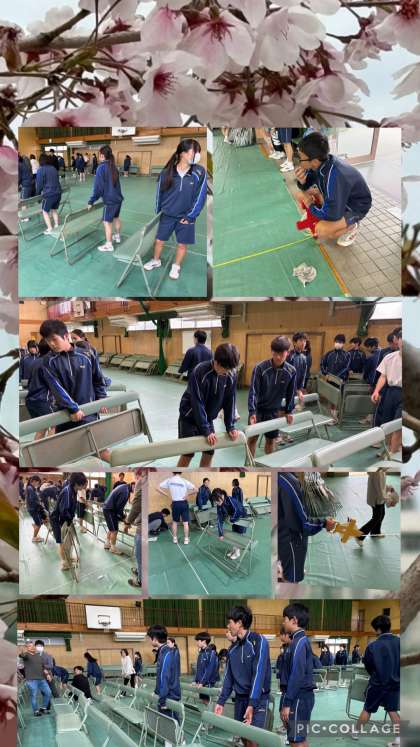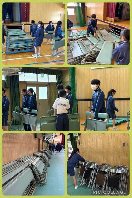 三年生がメジャーを使い、正確に椅子の位置を決め、間隔をとり椅子を並べていきます。