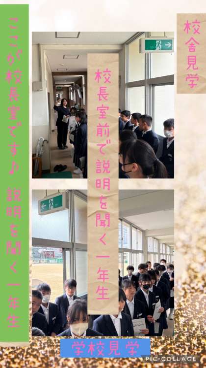 一時間目、一年生が校舎見学を行なっています。学級担任からの説明に耳を傾ける一年生です。