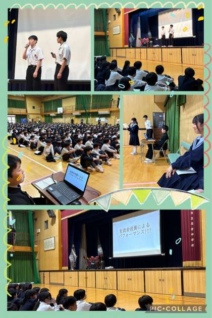 新入生歓迎会 公開日 2025/04/10 更新日 2025/04/10 お知らせ 緊張感から一瞬にして開放してくれた生徒会によるパフォーマンス。 先輩たちの面白さと優しさに一年生は笑顔いっぱいになっていました。 『生徒会活動へ積極的に参加してください』 いいね(0)