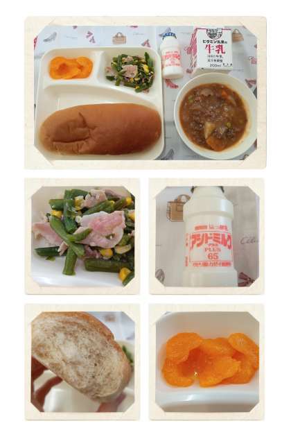 黒糖パン、牛乳、ビーフシチュー、ベーコンとさんどまめのソテー、みかん(缶)、発酵乳
