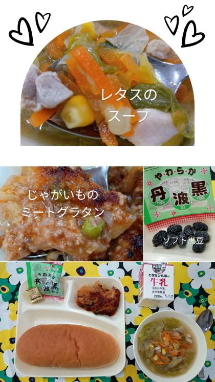 今日の給食(4月21日) 公開日 2025/04/21 更新日 2025/04/21 お知らせ コッペパン、バター、牛乳、じゃがいものミートグラタン、レタスのスープ、ソフト黒豆 ミートグラタンは、ひき肉、玉ねぎ、ジャガイモ、グリンピースが入っています。こんがり焼き目がついていて食欲をそそります。 スープは、普段生で食べることが多いレタスが入っています。柔らかいレタスもおいしいです! いいね(0)