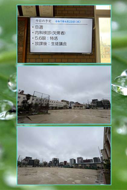 24節気の晩春を表す穀雨、今朝は植物を育てるあたたかい雨の朝となりました。運動場全面、広範囲が水浸しです。