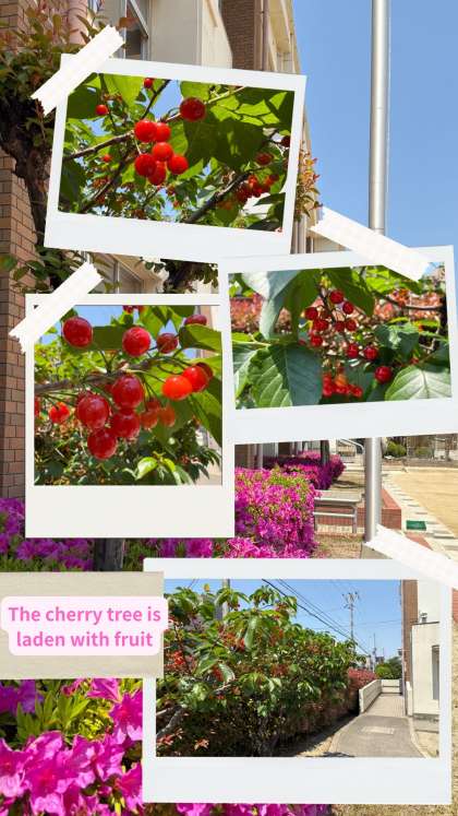 体育館、南門横にさくらんぼが鈴なりに実っています。まるで小さな宝石のようで美しいですね。このような情景は、日常の中で自然の豊かさや季節の移り変わりを感じさせてくれます。さくらんぼの実は、鮮やかな赤色が目を引きます。その実りを見つけたときの喜びは何にも代えがたいものです。このような自然との触れ合いは、心を豊かにし、日常の忙しさをひととき忘れさせてくれますね。