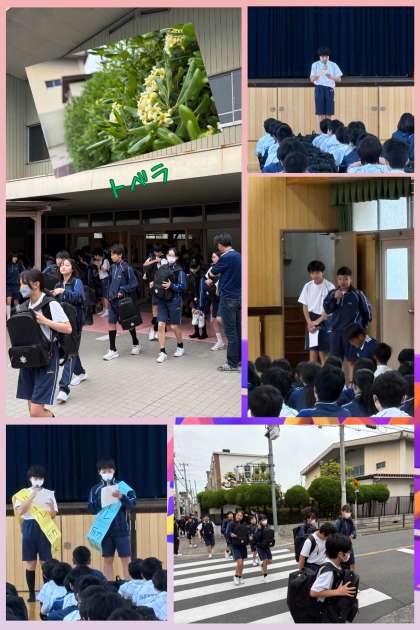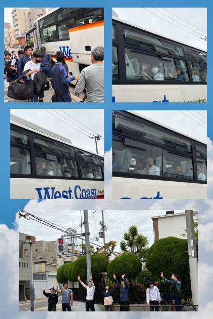 トベラの花が体育館前で咲く季節、一年生が『一泊移住』向けて信太山へとバスで出発しました。