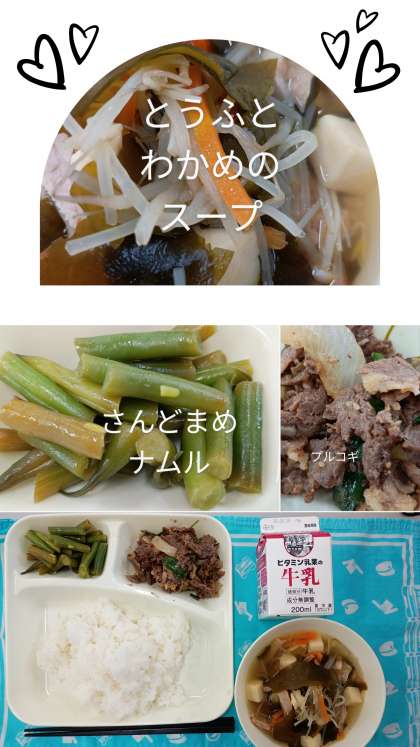 今日の給食(5月9日) 公開日 2025/05/09 更新日 2025/05/09 お知らせ ごはん、牛乳、プルコギ、とうふとわかめのスープ、さんどまめのナムル プルコギはニンニクの風味もあり味がしっかりしてご飯が進みます。 スープはとうふ・わかめ以外にも焼き豚やもやしが入っています。 ナムルはもやしが一般的ですが、さんどまめもおいしいです。 今日は韓国・朝鮮料理の献立でした! いいね(0)