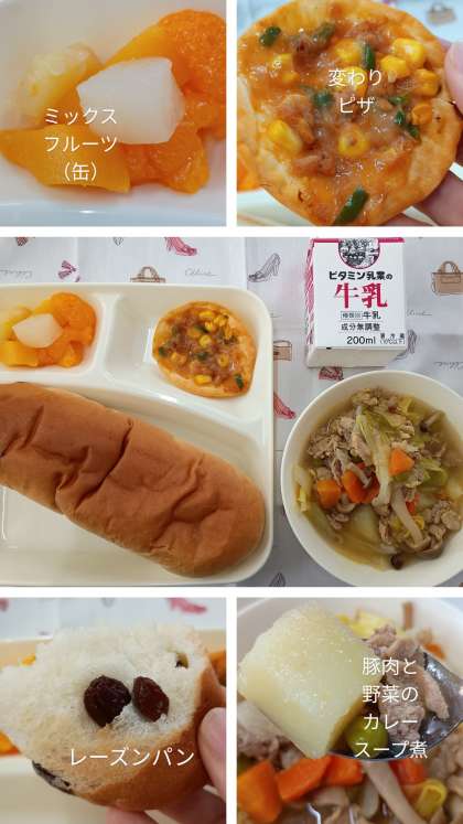 今日の給食(5月12日) 公開日 2025/05/12 更新日 2025/05/12 お知らせ レーズンパン、牛乳、豚肉と野菜のカレースープ煮、変わりピザ、ミックスフルーツ(缶) スープ煮は豚肉のほかにも、具沢山でした。スープはさらさら系で、カレー味がピリッとしています。 ピザは餃子の皮に、ツナ、コーン、ピーマンをのせて焼きます。簡単で美味しいので自宅でもできそうです! いいね(0)
