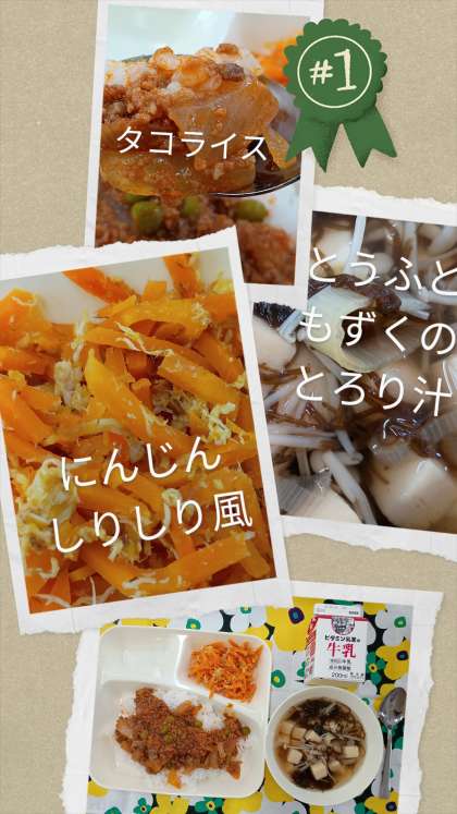 今日の給食(5月21日) 公開日 2025/06/02 更新日 2025/06/02 給食 牛乳、タコライス、とうふともずくのとろり汁、にんじんしりしり風 タコライスは沖縄でよく食べられているご当地料理で、メキシコ風アメリカ料理がもとになっているそうです。 炒めたたっぷりの豚肉・玉ねぎをケチャップで味付けし、ごはんにかけます。 スープは、こちらもたっぷり、もずくが入り本日は沖縄風メニューでした。 いいね(0)