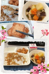 黒糖パン、牛乳、豚肉のバジル焼き、鶏肉とキャベツのスープ、うずら豆のグラッセ