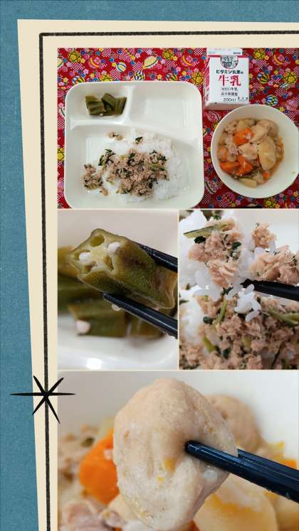 今日の給食(7月2日) 公開日 2025/07/02 更新日 2025/07/02 給食 ごはん、牛乳、鶏肉と一口(ひとくち)がんもの煮もの、オクラの梅風味、ツナっ葉いため 今日はご飯の上にかけるおかずでした。 ツナっ葉いためは簡単なので皆さんも作ってみてください。 (1)油をきったツナを炒める (2)そこへ刻んだ大根の葉っぱを加える ※ネギや小松菜でもいいかも! (3)醤油で味付けて完成 美味しいし簡単です! いいね(0)