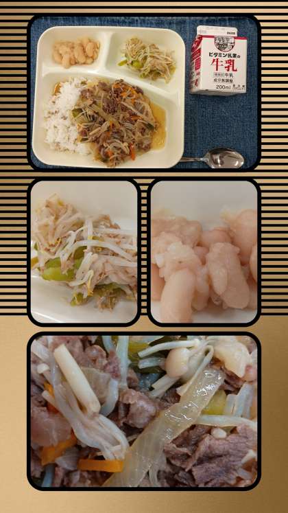 牛乳、牛丼、もやしとピーマンのごまいため、大福豆の煮もの
