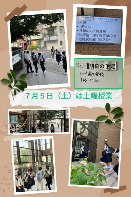 週末、時間ゆとりを持って登校 公開日 2025/07/04 更新日 2025/07/04 お知らせ 7月4日(金)晴れ 暑い一週間の週末、時間にゆとりを持って登校する生徒たちです。 8時25分前には生徒の姿はありません。 暑い季節、だれることなく登校し授業準備をしています。 明日は『土曜授業』です。3年生対象で卒業生から部活動を引退した後の学校生活等についてアドバイスをもらいます。 三年生の皆さん、お楽しみに。 いいね(0)