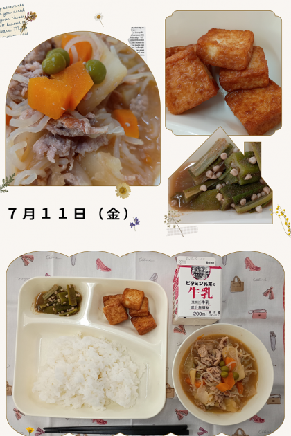 今日の給食(7月11日) 公開日 2025/07/11 更新日 2025/07/11 給食 ごはん、牛乳、みそ肉じゃが、あつあげのしょうがじょうゆかけ、オクラのおかかいため 今日の肉じゃがは味噌味です。いつものものと香りが違うので気づいた人はいたでしょうか?私はメニューを見るまで全く分からなかったです。 普段より風味?コク?深み?が増したようです。 いいね(0)