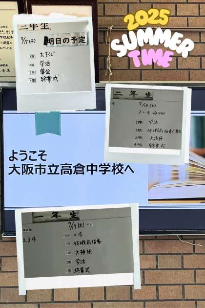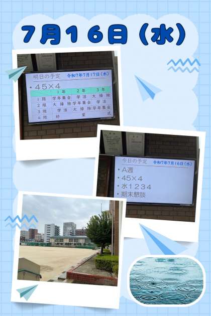 期末懇談会 最終日 公開日 2025/07/16 更新日 2025/07/16 お知らせ 7月16日(水) 登校時間帯は雨に降られました。10時現在は止んでいます。 期末懇談会最終日となりました。 各学年ホワイトボードには明日の予定が示されています。 3時間目までは、各学年でスケジュールが決まっています。学年集会、大清掃、学活をテレコで行い、4時間目に『終業式』を行います。 給食はこの日が最終日となります。 いいね(0)